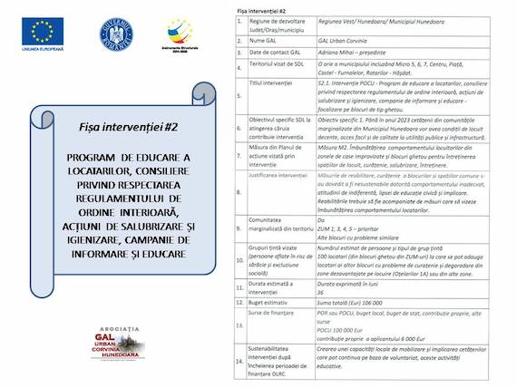 În cadrul GAL Urban Corvinia, publicăm o serie de informații care să vină în întâmpinarea persoanelor și grupurilor vizate și care pot aduce lumină în cadrul ariei de resfrângere aferente activităților și acțiunilor ce pot fi întreprinse. Puteți să parcurgeți fișele de intervenție disponibile în galeria de imagine de mai jos sau puteți să parcurgeți informațiile căutate în format PDF, fișier disponibil spre consultate – CLICK AICI.