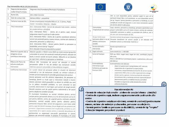 În cadrul GAL Urban Corvinia, publicăm o serie de informații care să vină în întâmpinarea persoanelor și grupurilor vizate și care pot aduce lumină în cadrul ariei de resfrângere aferente activităților și acțiunilor ce pot fi întreprinse. Puteți să parcurgeți fișele de intervenție disponibile în galeria de imagine de mai jos sau puteți să parcurgeți informațiile căutate în format PDF, fișier disponibil spre consultate – CLICK AICI.