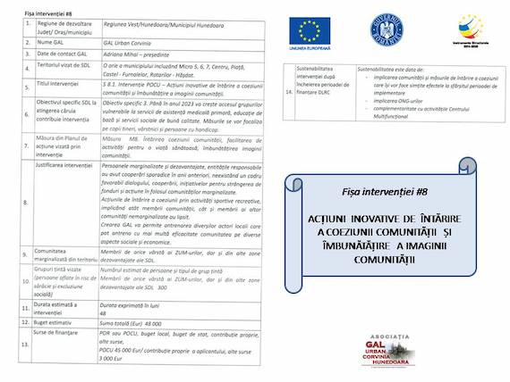 În cadrul GAL Urban Corvinia, publicăm o serie de informații care să vină în întâmpinarea persoanelor și grupurilor vizate și care pot aduce lumină în cadrul ariei de resfrângere aferente activităților și acțiunilor ce pot fi întreprinse. Puteți să parcurgeți fișele de intervenție disponibile în galeria de imagine de mai jos sau puteți să parcurgeți informațiile căutate în format PDF, fișier disponibil spre consultate – CLICK AICI.